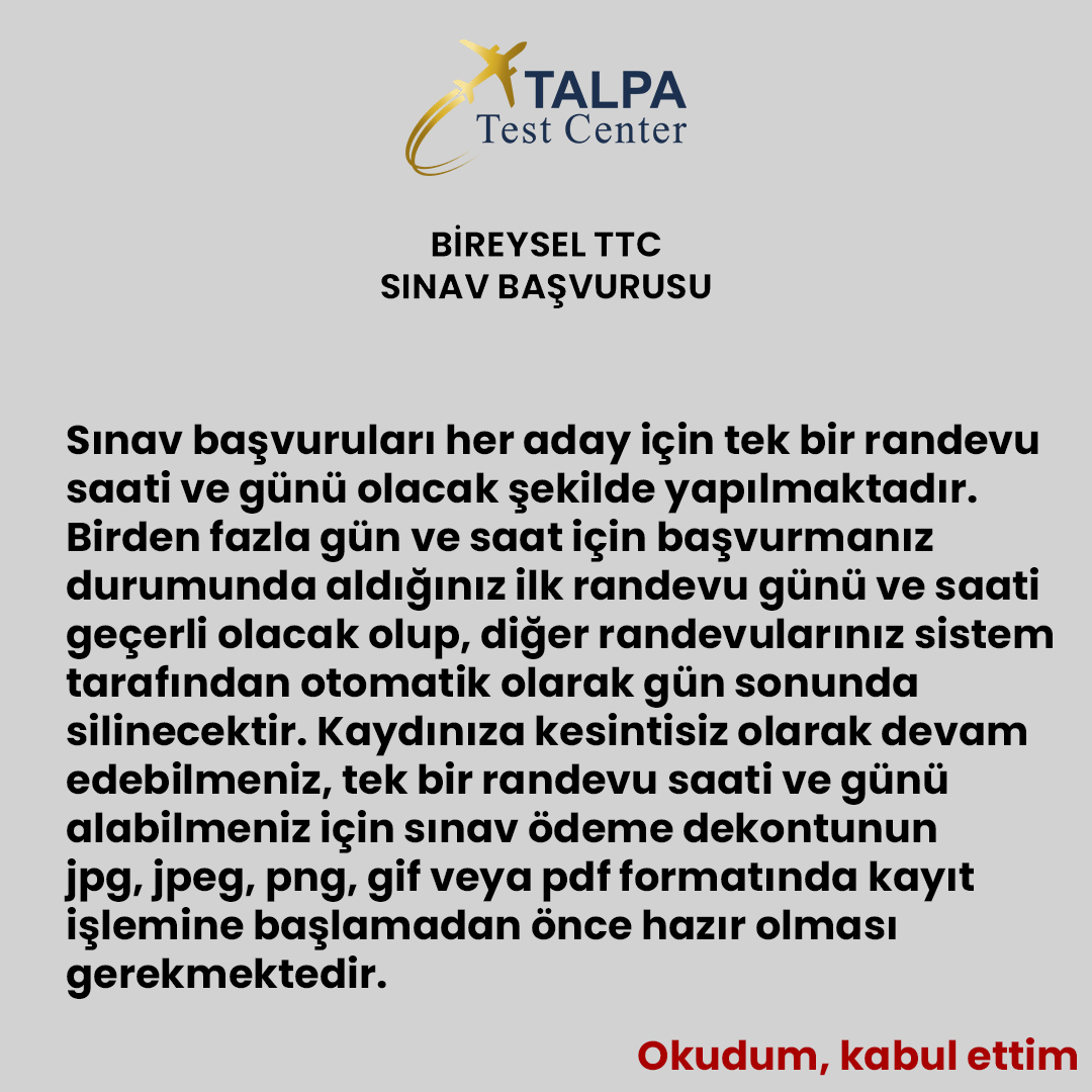 Sınav kaydınızı oluşturduktan sonra size sınav yeri ve saatine ilişkin bilgileri içeren bir onay e-postası gönderilecektir. Sınav tarihinizden önce herhangi bir e-posta almamanız durumunda, lütfen e-posta veya telefon aracılığıyla sınav merkezimiz ile irtibata geçin. Sınav tarihinin TALPA Test Center tarafından değiştirilmesi durumunda bu bilgi adaya bildirilir, yeni sınav tarihinin onayı alınır.